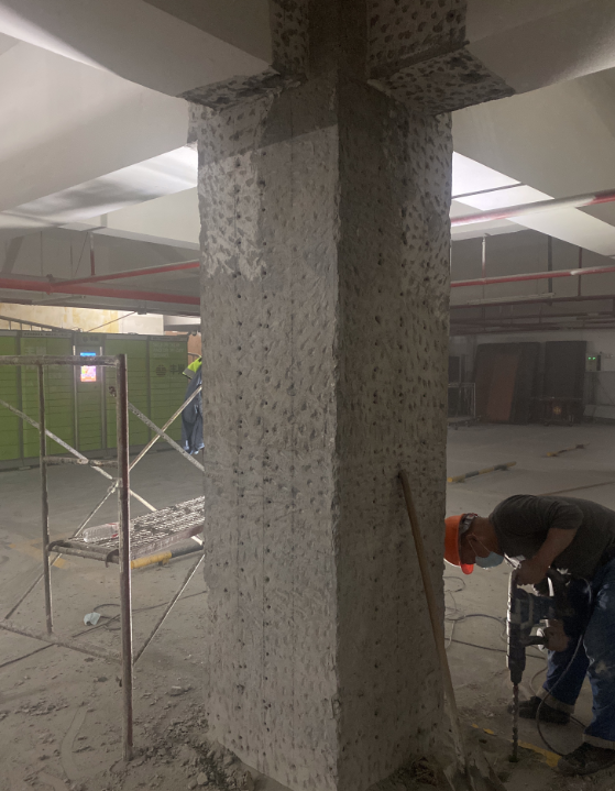 柱增大截面加固工艺是既有建筑结构加固的核心技术,兼具技术深度与施工复杂性。设计阶段需经精密力学计算确定截面尺寸与配筋方案,兼顾新旧混凝土粘结性与应力传递效率;施工环节需完成原柱界面凿毛植筋、高精度钢筋绑扎、受限空间模板支设及振捣优化浇筑等工序。