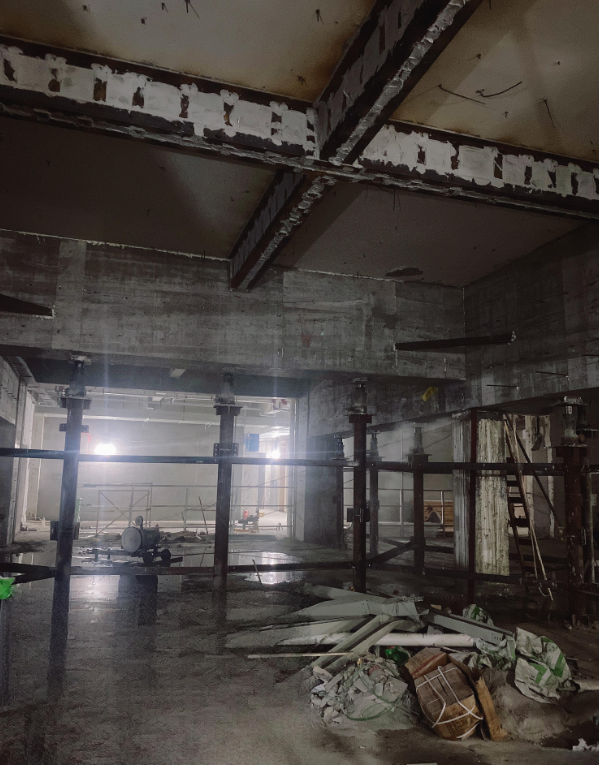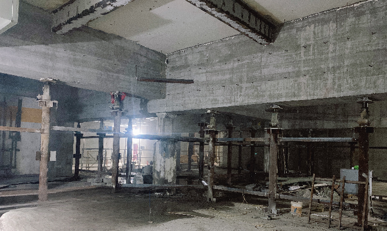 托梁拔柱是既有建筑结构改造的核心技术,通过临时支撑体系(如钢立柱、横向钢梁)转移原柱荷载,依托定制化托换梁承接并传递上部荷载,实现柱的安全置换或拔除,以优化建筑空间布局。图中呈现的是托梁拔柱技术在建筑改造工程中的典型应用场景。